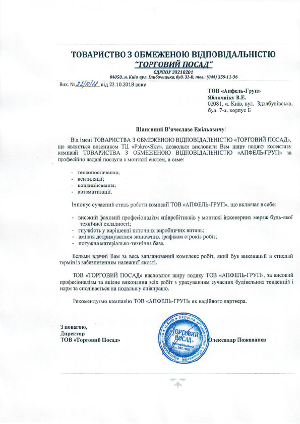 Хотим отметить позитивный опыт работы с компанией Apfel Group, которая выполняла поставку, монтажные и пуско-наладочные работы оборудования для вентиляции 2-й очереди строительства - Птицефабрики "Винницкий бройлер". Рекомендуем как надёжного партнера!